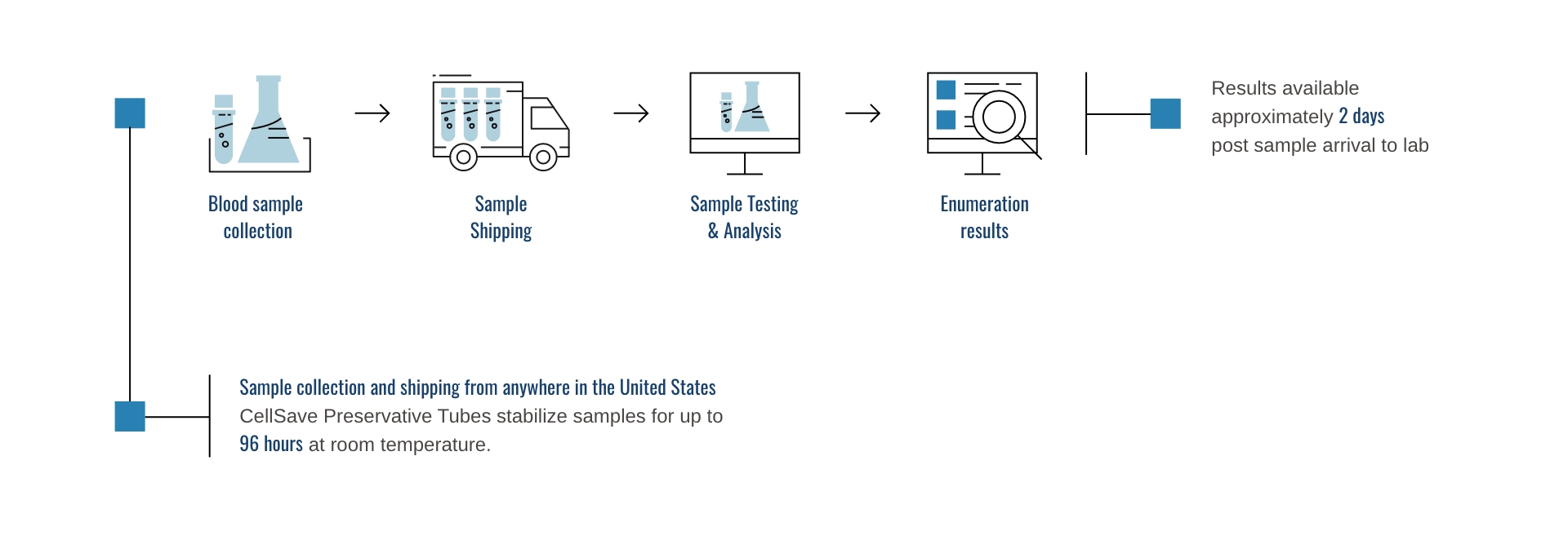 Ordering a CTC enumeration test is simple. Request a portal account (HCPs only), and once it’s set up, you’ll be able to request test kits online. The collection boxes will be shipped to your location and include everything you need, including the CellSave Sample Collection Tubes, barcoded labels, shipping materials, and detailed instructions. For more detailed instructions, click here. Most results are available within two days from the date we receive a patient’s sample in our laboratory.